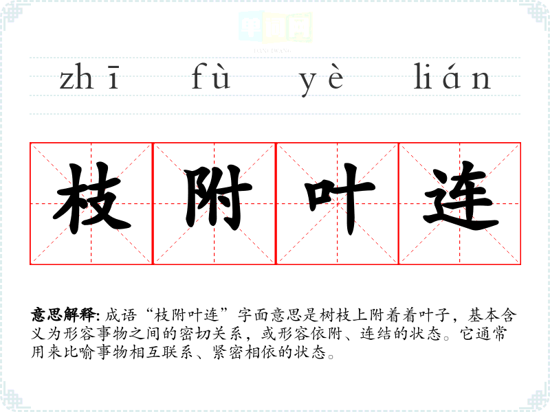 成语“枝附叶连”字面意思是树枝上附着着叶子,基本含义为形容事物之间的密切关系,或形容依附、连结的状态。它通常用来比喻事物相互联系、紧密相依的状态。