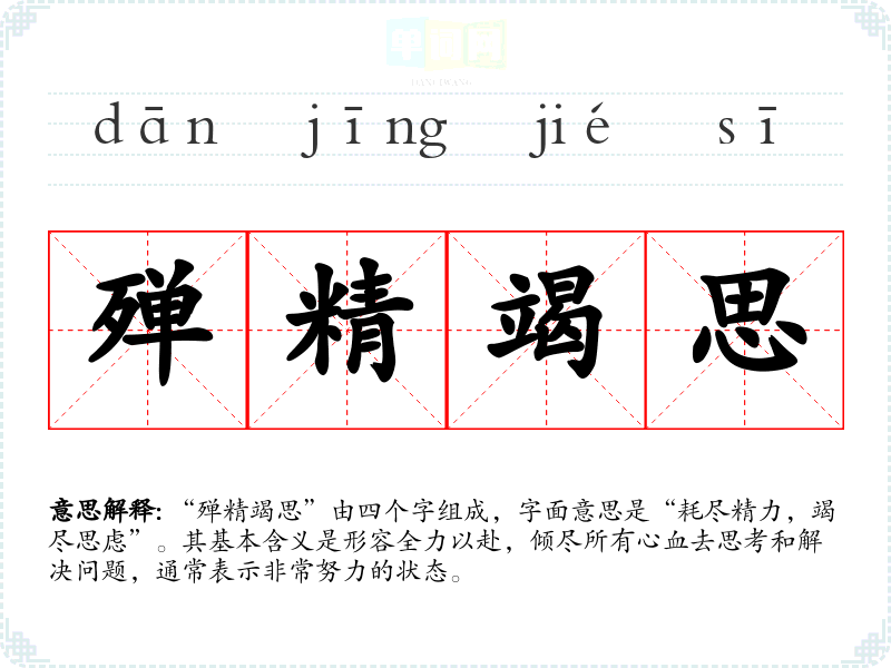 “殚精竭思”由四个字组成,字面意思是“耗尽精力,竭尽思虑”。其基本含义是形容全力以赴,倾尽所有心血去思考和解决问题,通常表示非常努力的状态。