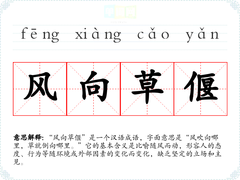“风向草偃”是一个汉语成语,字面意思是“风吹向哪里,草就倒向哪里。”它的基本含义是比喻随风而动,形容人的态度、行为等随环境或外部因素的变化而变化,缺乏坚定的立场和主见。