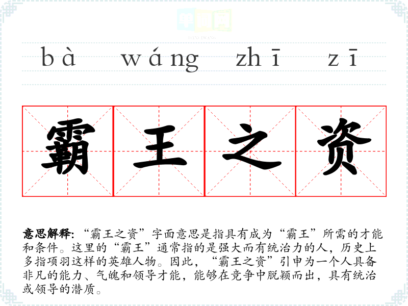 “霸王之资”字面意思是指具有成为“霸王”所需的才能和条件。这里的“霸王”通常指的是强大而有统治力的人,历史上多指项羽这样的英雄人物。因此,“霸王之资”引申为一个人具备非凡的能力、气魄和领导才能,能够在竞争中脱颖而出,具有统治或领导的潜质。