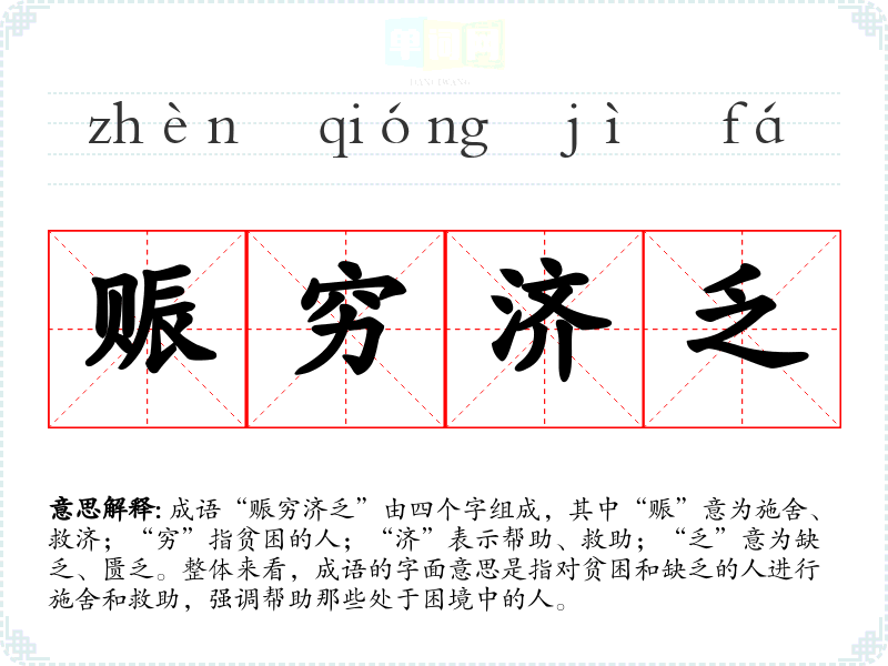 成语“赈穷济乏”由四个字组成,其中“赈”意为施舍、救济;“穷”指贫困的人;“济”表示帮助、救助;“乏”意为缺乏、匮乏。整体来看,成语的字面意思是指对贫困和缺乏的人进行施舍和救助,强调帮助那些处于困境中的人。