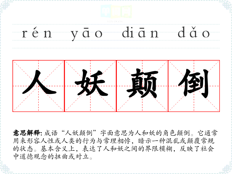 成语“人妖颠倒”字面意思为人和妖的角色颠倒。它通常用来形容人性或人类的行为与常理相悖,暗示一种混乱或颠覆常规的状态。基本含义上,表达了人和妖之间的界限模糊,反映了社会中道德观念的扭曲或对立。