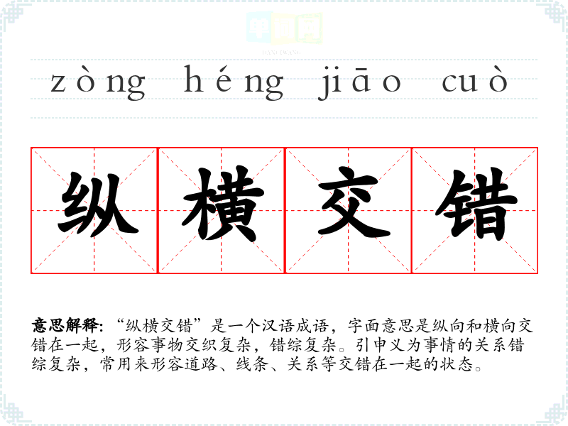 “纵横交错”是一个汉语成语,字面意思是纵向和横向交错在一起,形容事物交织复杂,错综复杂。引申义为事情的关系错综复杂,常用来形容道路、线条、关系等交错在一起的状态。