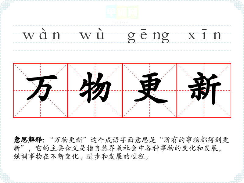 “万物更新”这个成语字面意思是“所有的事物都得到更新”,它的主要含义是指自然界或社会中各种事物的变化和发展,强调事物在不断变化、进步和发展的过程。