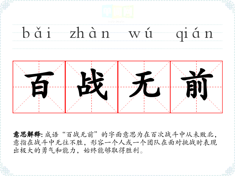 成语“百战无前”的字面意思为在百次战斗中从未败北,意指在战斗中无往不胜,形容一个人或一个团队在面对挑战时表现出极大的勇气和能力,始终能够取得胜利。