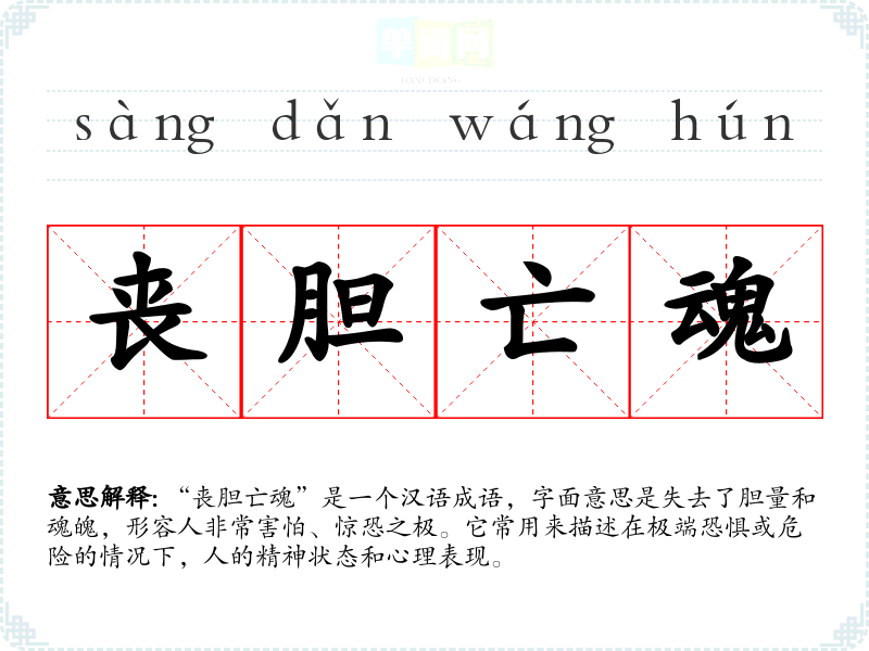 “丧胆亡魂”是一个汉语成语,字面意思是失去了胆量和魂魄,形容人非常害怕、惊恐之极。它常用来描述在极端恐惧或危险的情况下,人的精神状态和心理表现。