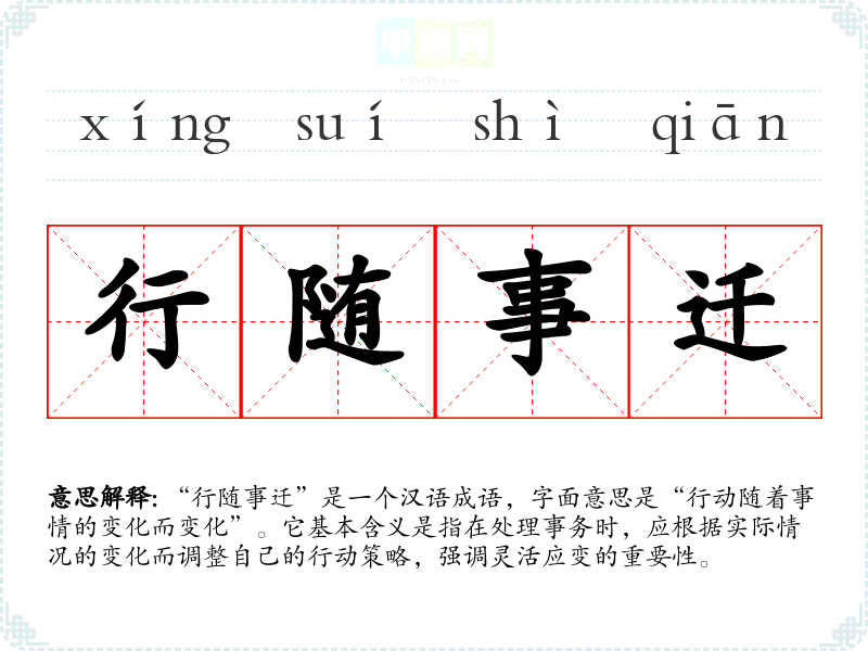 “行随事迁”是一个汉语成语,字面意思是“行动随着事情的变化而变化”。它基本含义是指在处理事务时,应根据实际情况的变化而调整自己的行动策略,强调灵活应变的重要性。