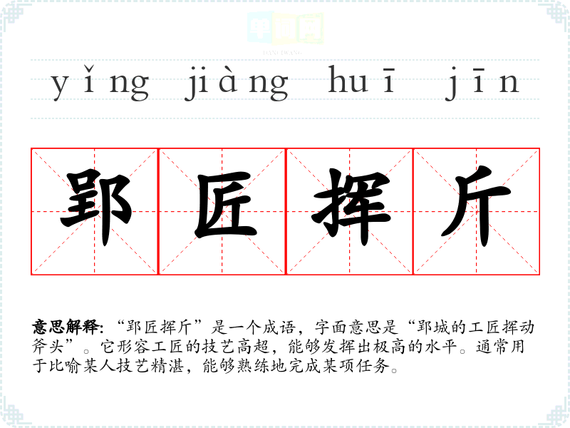 “郢匠挥斤”是一个成语,字面意思是“郢城的工匠挥动斧头”。它形容工匠的技艺高超,能够发挥出极高的水平。通常用于比喻某人技艺精湛,能够熟练地完成某项任务。