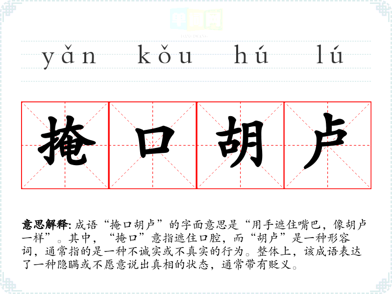 成语“掩口胡卢”的字面意思是“用手遮住嘴巴,像胡卢一样”。其中,“掩口”意指遮住口腔,而“胡卢”是一种形容词,通常指的是一种不诚实或不真实的行为。整体上,该成语表达了一种隐瞒或不愿意说出真相的状态,通常带有贬义。