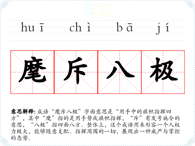成语“麾斥八极”字面意思是“用手中的旗帜指挥四方”,其中“麾”指的是用手势或旗帜指挥,“斥”有发号施令的意思,“八极”指四面八方。整体上,这个成语用来形容一个人权力极大,能够随意支配、指挥周围的一切,展现出一种威严与掌控的态势。