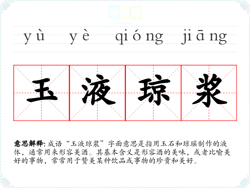 成语“玉液琼浆”字面意思是指用玉石和琼瑶制作的液体,通常用来形容美酒。其基本含义是形容酒的美味,或者比喻美好的事物,常常用于赞美某种饮品或事物的珍贵和美好。