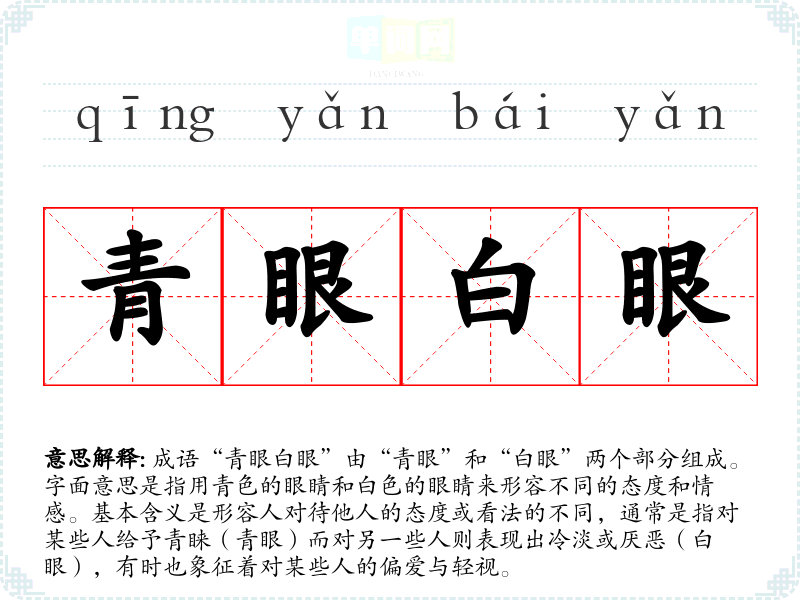 “青眼白眼”最早见于《红楼梦》中,书中提到“青眼”是指对某个人或事物的偏爱,而“白眼”则是冷漠或不屑的表现。这个成语反映了人际关系中常见的差别对待,也体现了古代社会对人情冷暖的深刻理解。