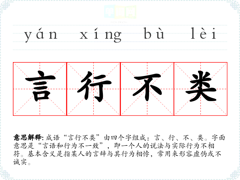 成语“言行不类”由四个字组成:言、行、不、类。字面意思是“言语和行为不一致”,即一个人的说法与实际行为不相符。基本含义是指某人的言辞与其行为相悖,常用来形容虚伪或不诚实。