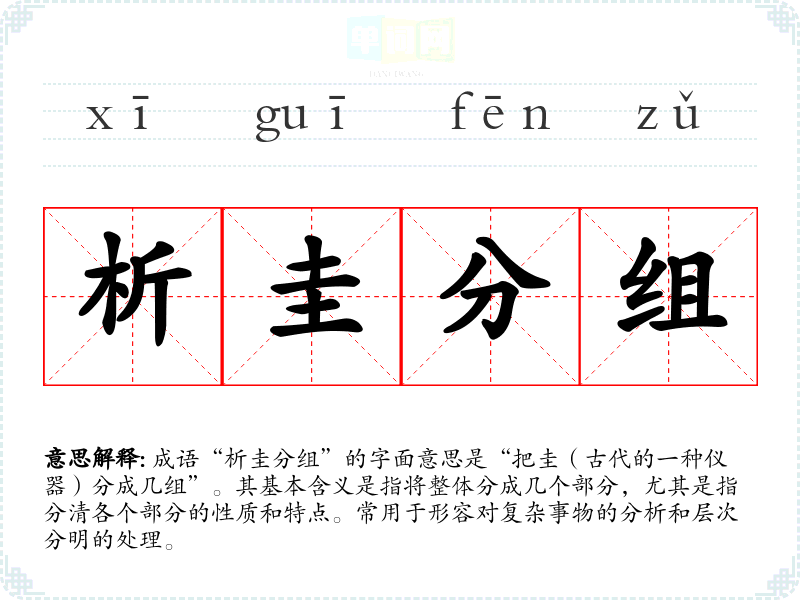 成语“析圭分组”的字面意思是“把圭(古代的一种仪器)分成几组”。其基本含义是指将整体分成几个部分,尤其是指分清各个部分的性质和特点。常用于形容对复杂事物的分析和层次分明的处理。