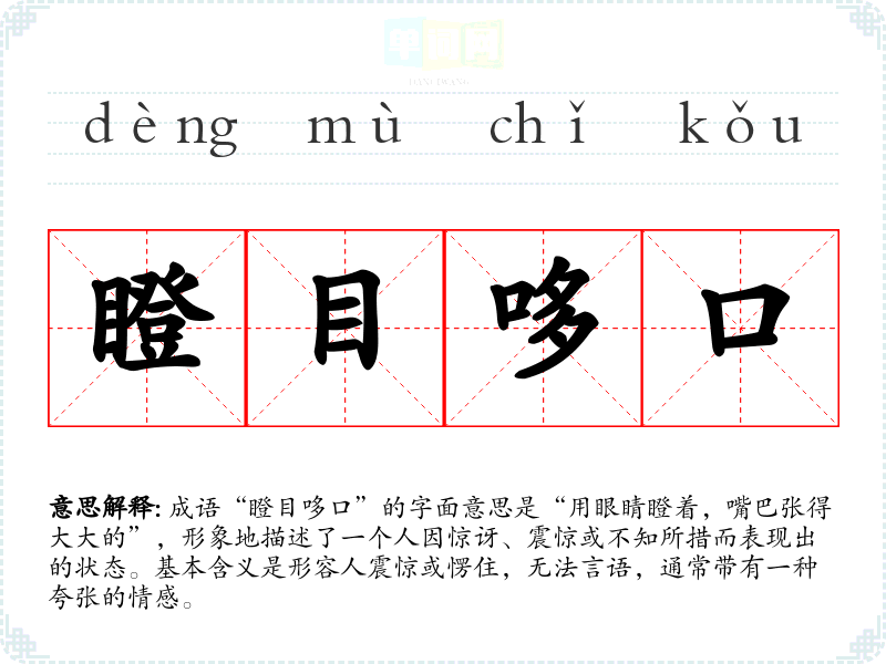 成语“瞪目哆口”的字面意思是“用眼睛瞪着,嘴巴张得大大的”,形象地描述了一个人因惊讶、震惊或不知所措而表现出的状态。基本含义是形容人震惊或愣住,无法言语,通常带有一种夸张的情感。