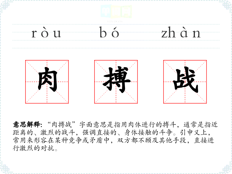 “肉搏战”字面意思是指用肉体进行的搏斗,通常是指近距离的、激烈的战斗,强调直接的、身体接触的斗争。引申义上,常用来形容在某种竞争或矛盾中,双方都不顾及其他手段,直接进行激烈的对抗。