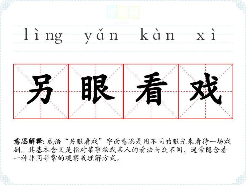 成语“另眼看戏”字面意思是用不同的眼光来看待一场戏剧。其基本含义是指对某事物或某人的看法与众不同,通常隐含着一种非同寻常的观察或理解方式。