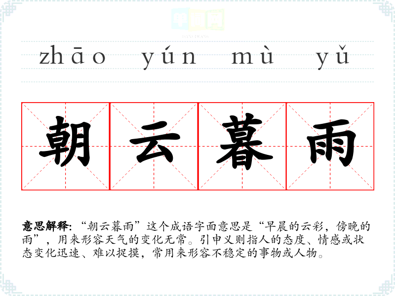 “朝云暮雨”这个成语字面意思是“早晨的云彩,傍晚的雨”,用来形容天气的变化无常。引申义则指人的态度、情感或状态变化迅速、难以捉摸,常用来形容不稳定的事物或人物。