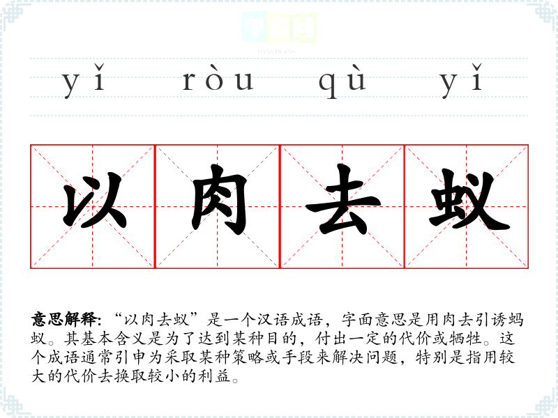 “以肉去蚁”是一个汉语成语,字面意思是用肉去引诱蚂蚁。其基本含义是为了达到某种目的,付出一定的代价或牺牲。这个成语通常引申为采取某种策略或手段来解决问题,特别是指用较大的代价去换取较小的利益。