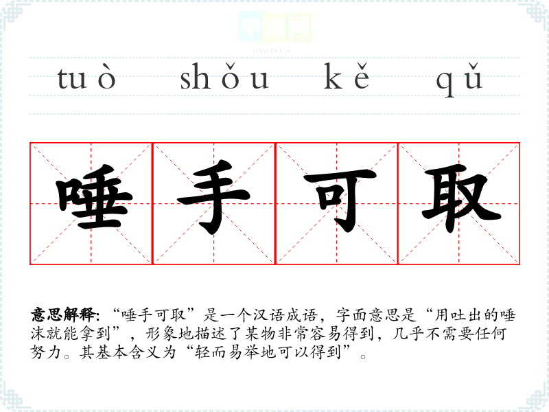 “唾手可取”是一个汉语成语,字面意思是“用吐出的唾沫就能拿到”,形象地描述了某物非常容易得到,几乎不需要任何努力。其基本含义为“轻而易举地可以得到”。