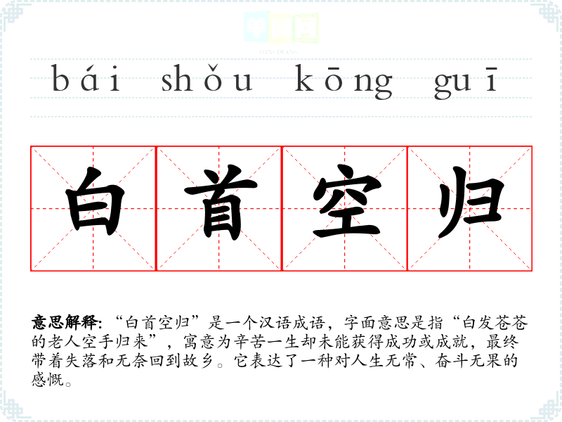 “白首空归”是一个汉语成语,字面意思是指“白发苍苍的老人空手归来”,寓意为辛苦一生却未能获得成功或成就,最终带着失落和无奈回到故乡。它表达了一种对人生无常、奋斗无果的感慨。