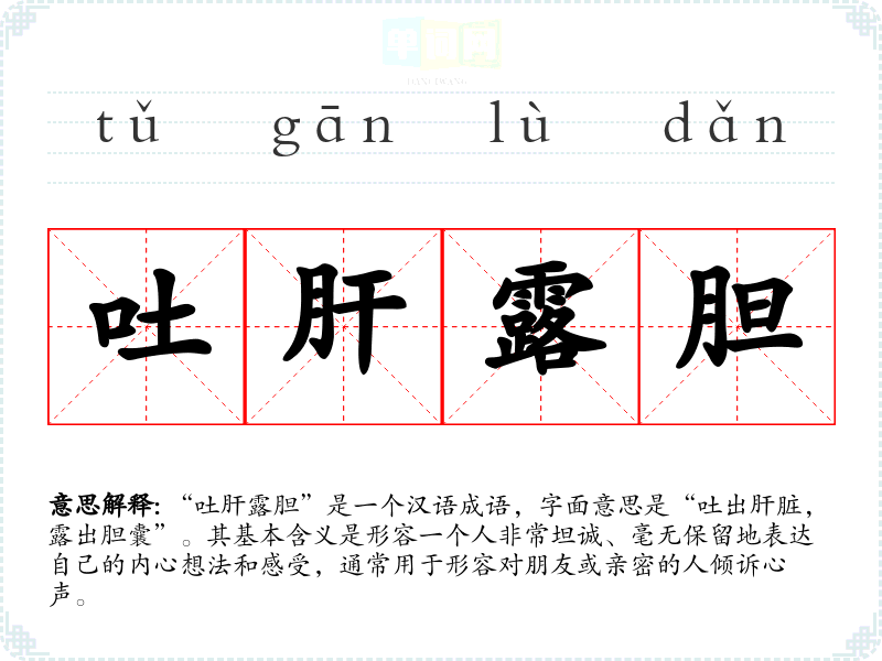 “吐肝露胆”是一个汉语成语,字面意思是“吐出肝脏,露出胆囊”。其基本含义是形容一个人非常坦诚、毫无保留地表达自己的内心想法和感受,通常用于形容对朋友或亲密的人倾诉心声。