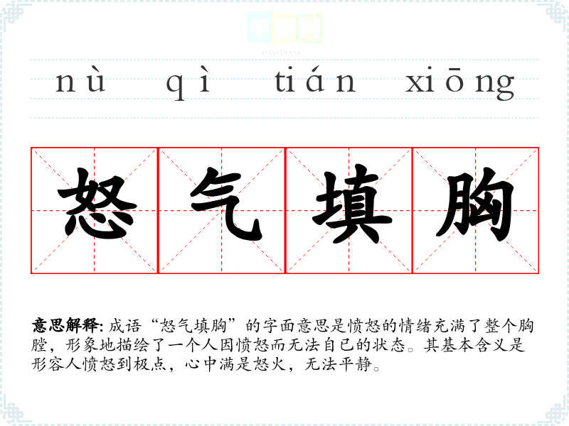 成语“怒气填胸”的字面意思是愤怒的情绪充满了整个胸膛,形象地描绘了一个人因愤怒而无法自已的状态。其基本含义是形容人愤怒到极点,心中满是怒火,无法平静。