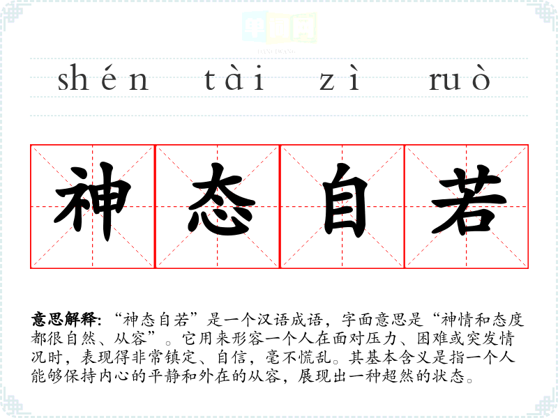 “神态自若”出自《后汉书·班固传》:“若神态之无所惭。” 成语中“神态”指的是一个人的表情和姿态,“自若”则意味着自然、如常。该成语的使用背景可以追溯到古代,强调了在复杂或压力环境下保持镇静的重要性。
