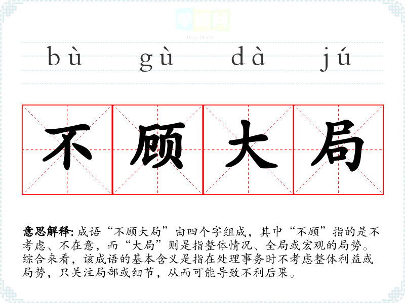 成语“不顾大局”由四个字组成,其中“不顾”指的是不考虑、不在意,而“大局”则是指整体情况、全局或宏观的局势。综合来看,该成语的基本含义是指在处理事务时不考虑整体利益或局势,只关注局部或细节,从而可能导致不利后果。