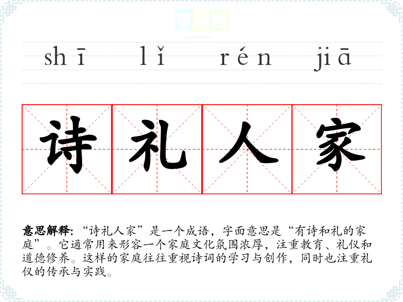 “诗礼人家”是一个成语,字面意思是“有诗和礼的家庭”。它通常用来形容一个家庭文化氛围浓厚,注重教育、礼仪和道德修养。这样的家庭往往重视诗词的学*与创作,同时也注重礼仪的传承与实践。