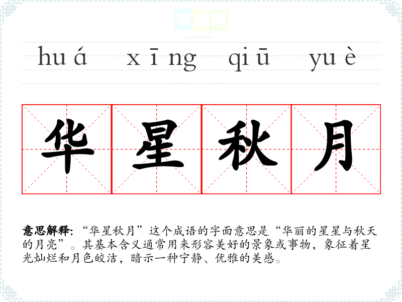“华星秋月”这个成语的字面意思是“华丽的星星与秋天的月亮”。其基本含义通常用来形容美好的景象或事物,象征着星光灿烂和月色皎洁,暗示一种宁静、优雅的美感。