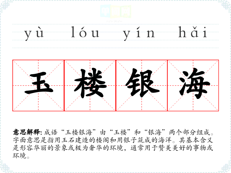 成语“玉楼银海”由“玉楼”和“银海”两个部分组成。字面意思是指用玉石建造的楼阁和用银子筑成的海洋。其基本含义是形容华丽的景象或极为奢华的环境,通常用于赞美美好的事物或环境。