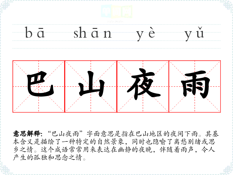 “巴山夜雨”字面意思是指在巴山地区的夜间下雨。其基本含义是描绘了一种特定的自然景象,同时也隐喻了离愁别绪或思乡之情。这个成语常常用来表达在幽静的夜晚,伴随着雨声,令人产生的孤独和思念之情。