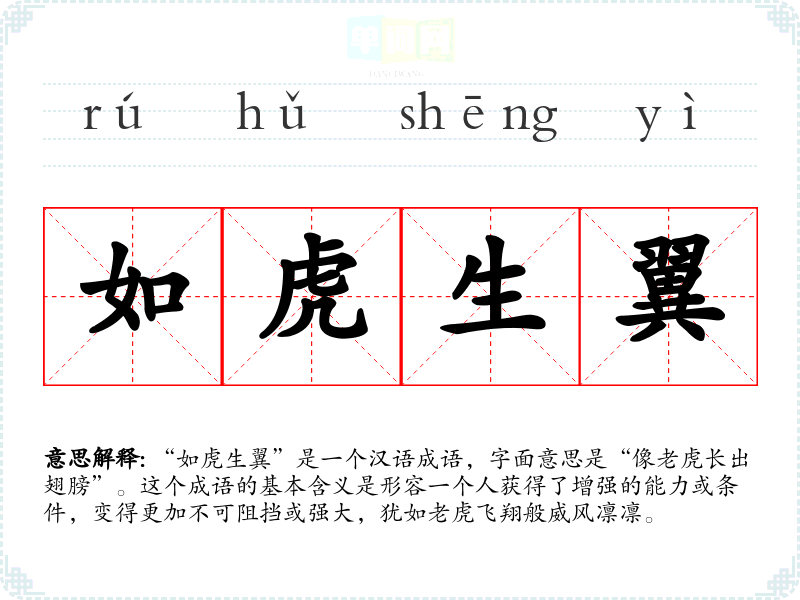 “如虎生翼”是一个汉语成语,字面意思是“像长出翅膀”。这个成语的基本含义是形容一个人获得了增强的能力或条件,变得更加不可阻挡或强大,犹如飞翔般威风凛凛。