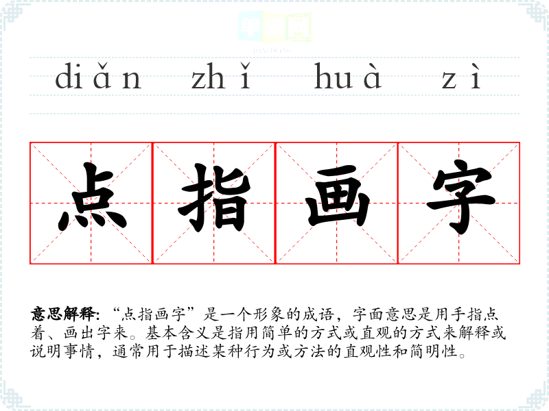 “点指画字”是一个形象的成语,字面意思是用手指点着、画出字来。基本含义是指用简单的方式或直观的方式来解释或说明事情,通常用于描述某种行为或方法的直观性和简明性。