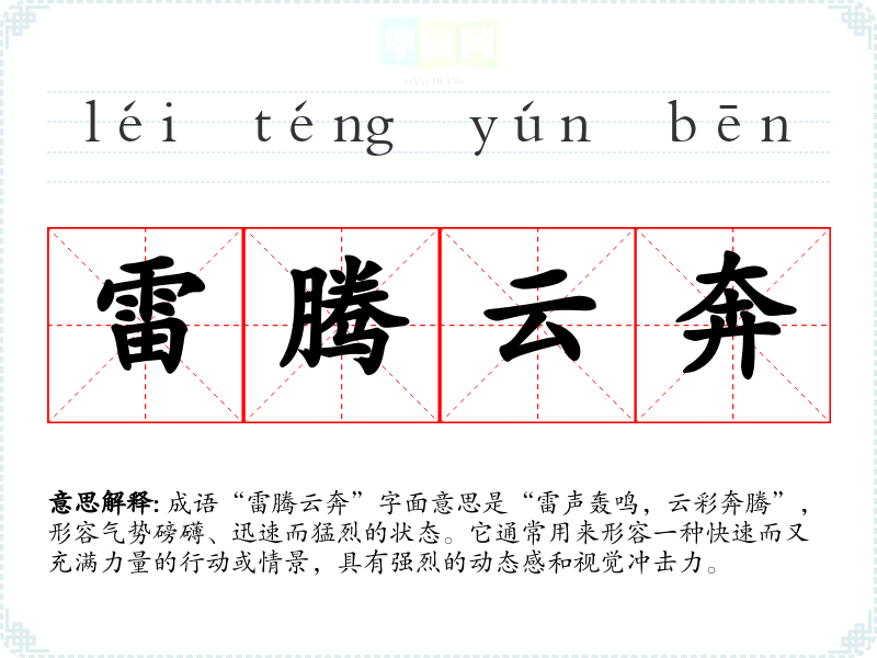 成语“雷腾云奔”字面意思是“雷声轰鸣,云彩奔腾”,形容气势磅礴、迅速而猛烈的状态。它通常用来形容一种快速而又充满力量的行动或情景,具有强烈的动态感和视觉冲击力。
