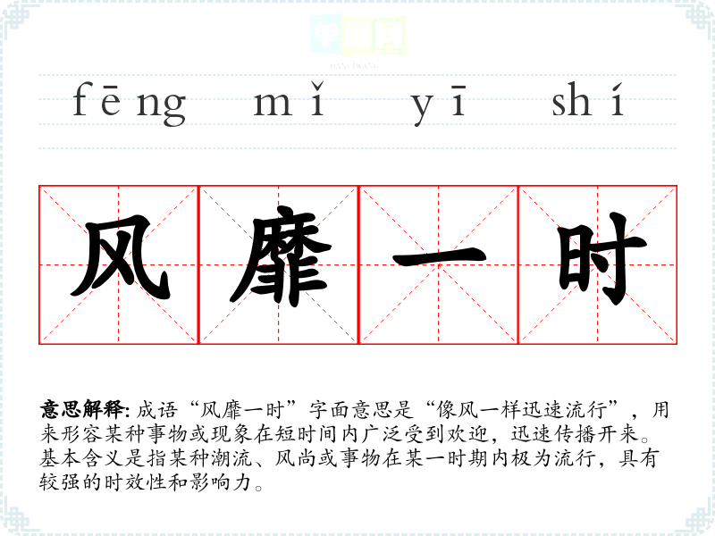 成语“风靡一时”字面意思是“像风一样迅速流行”,用来形容某种事物或现象在短时间内广泛受到欢迎,迅速传播开来。基本含义是指某种潮流、风尚或事物在某一时期内极为流行,具有较强的时效性和影响力。
