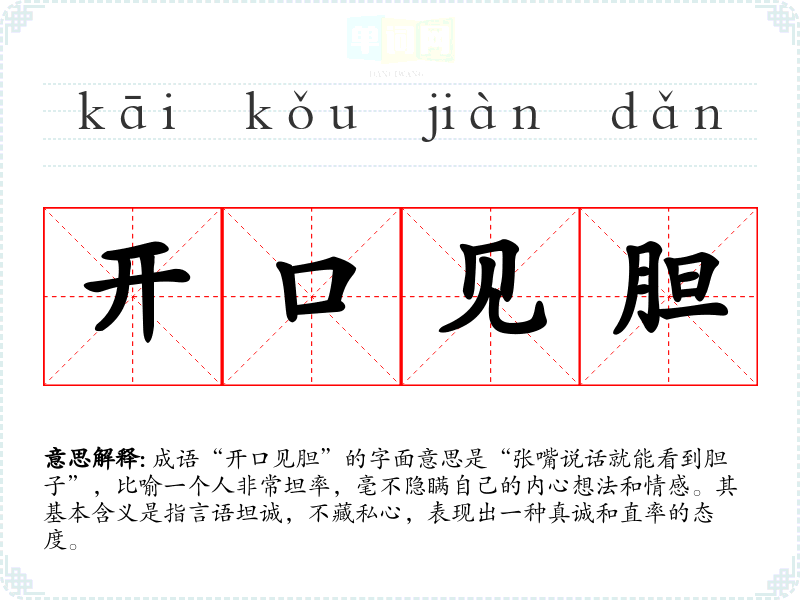 | 开口见胆 | 说话直爽,没有隐曲。同“开口见心”。 |