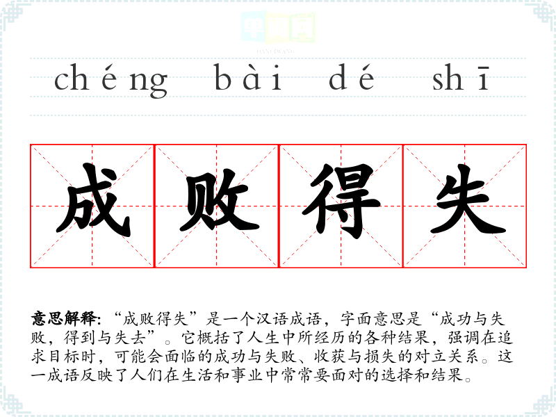 “成败得失”是一个汉语成语,字面意思是“成功与失败,得到与失去”。它概括了人生中所经历的各种结果,强调在追求目标时,可能会面临的成功与失败、收获与损失的对立关系。这一成语反映了人们在生活和事业中常常要面对的选择和结果。