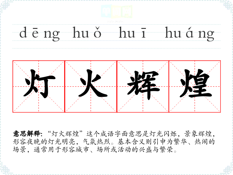 “灯火辉煌”这个成语字面意思是灯光闪烁,景象辉煌,形容夜晚的灯光明亮,气氛热烈。基本含义则引申为繁华、热闹的场景,通常用于形容城市、场所或活动的兴盛与繁荣。