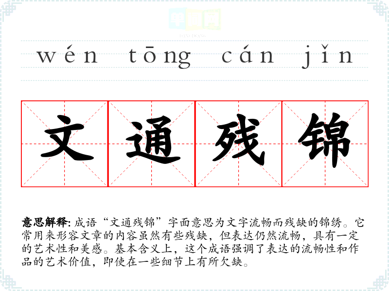 成语“文通残锦”字面意思为文字流畅而残缺的锦绣。它常用来形容文章的内容虽然有些残缺,但表达仍然流畅,具有一定的艺术性和美感。基本含义上,这个成语强调了表达的流畅性和作品的艺术价值,即使在一些细节上有所欠缺。