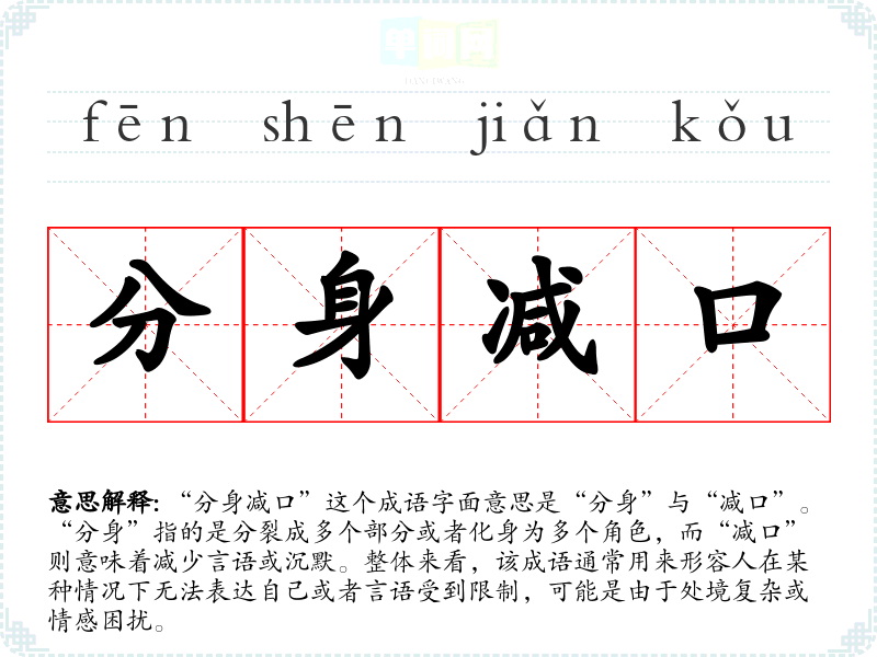 “分身减口”这个成语字面意思是“分身”与“减口”。“分身”指的是分裂成多个部分或者化身为多个角色,而“减口”则意味着减少言语或沉默。整体来看,该成语通常用来形容人在某种情况下无法表达自己或者言语受到限制,可能是由于处境复杂或情感困扰。