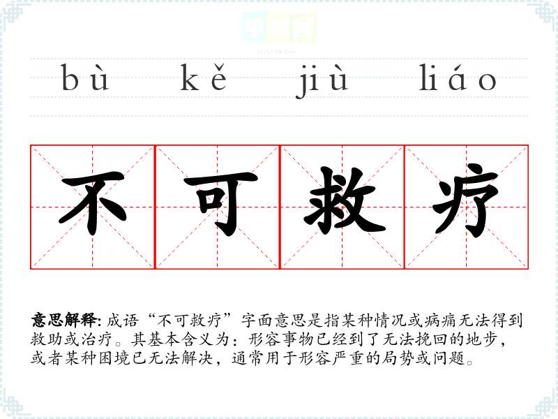 成语“不可救疗”字面意思是指某种情况或病痛无法得到救助或治疗。其基本含义为:形容事物已经到了无法挽回的地步,或者某种困境已无法解决,通常用于形容严重的局势或问题。