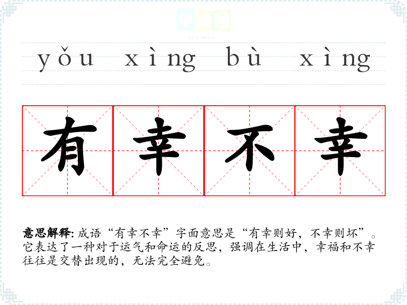 成语“有幸不幸”字面意思是“有幸则好,不幸则坏”。它表达了一种对于运气和命运的反思,强调在生活中,幸福和不幸往往是交替出现的,无法完全避免。