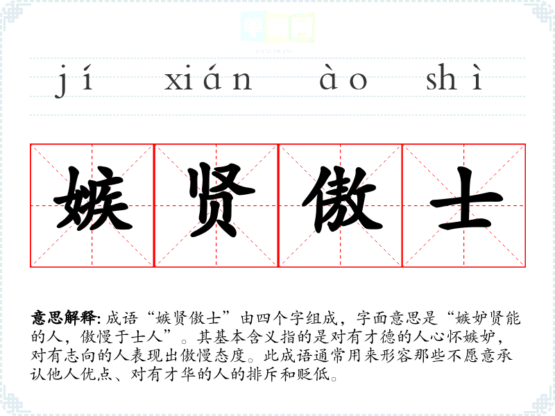 成语“嫉贤傲士”由四个字组成,字面意思是“嫉妒贤能的人,傲慢于士人”。其基本含义指的是对有才德的人心怀嫉妒,对有志向的人表现出傲慢态度。此成语通常用来形容那些不愿意承认他人优点、对有才华的人的排斥和贬低。