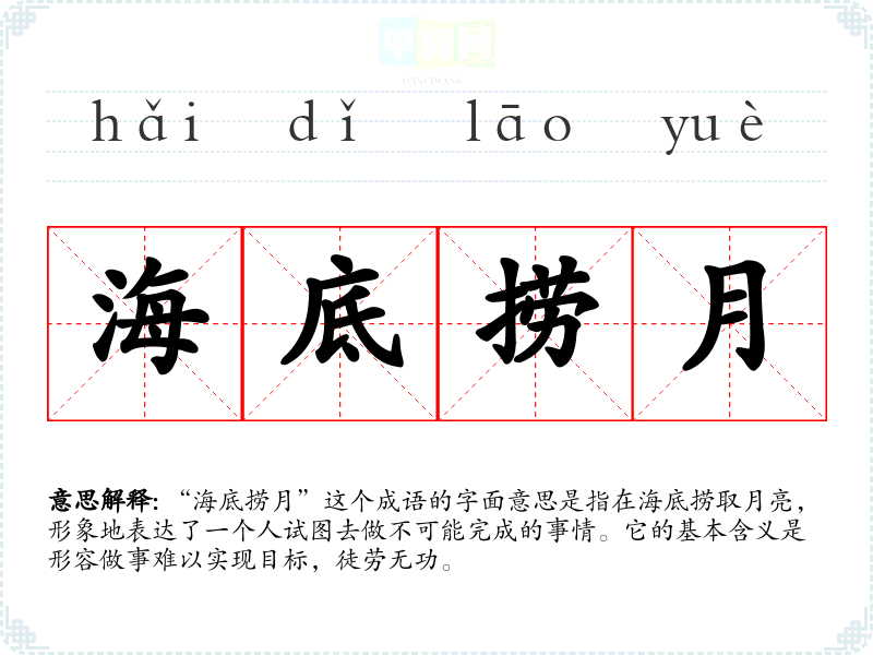 “海底捞月”这个成语的字面意思是指在海底捞取月亮,形象地表达了一个人试图去做不可能完成的事情。它的基本含义是形容做事难以实现目标,徒劳无功。