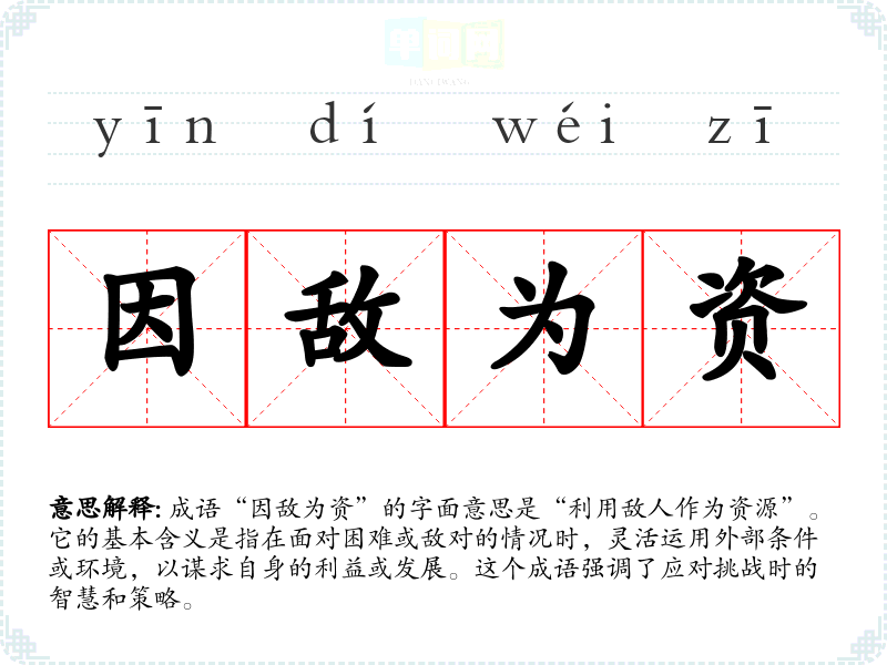 成语“因敌为资”的字面意思是“利用敌人作为资源”。它的基本含义是指在面对困难或敌对的情况时,灵活运用外部条件或环境,以谋求自身的利益或发展。这个成语强调了应对挑战时的智慧和策略。