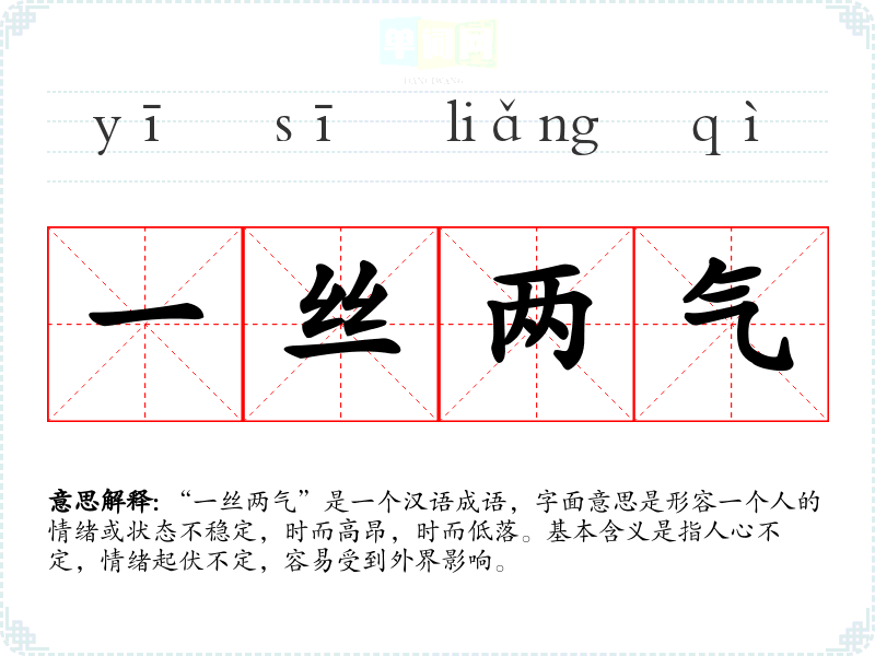 “一丝两气”是一个汉语成语,字面意思是形容一个人的情绪或状态不稳定,时而高昂,时而低落。基本含义是指人心不定,情绪起伏不定,容易受到外界影响。