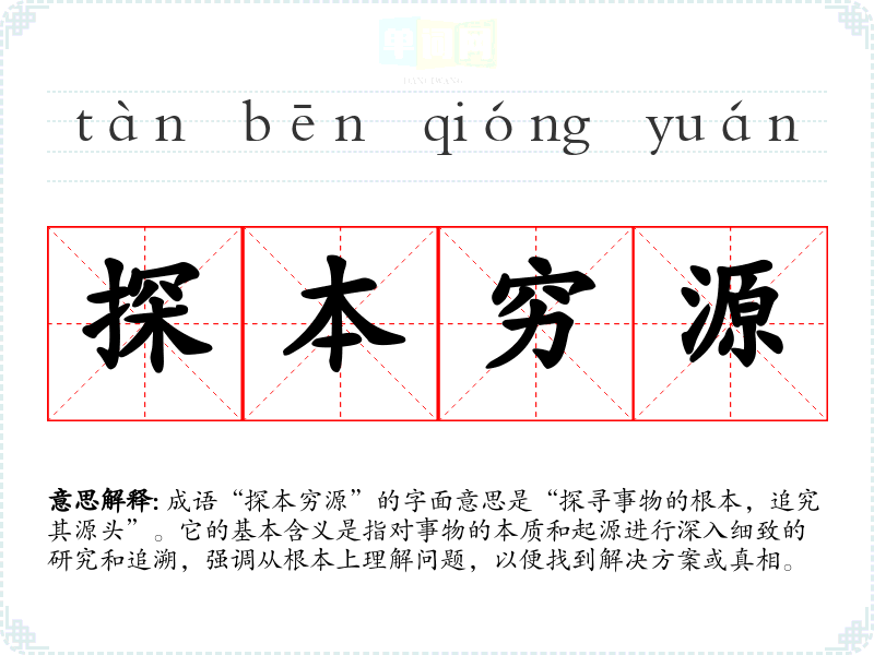 成语“探本穷源”的字面意思是“探寻事物的根本,追究其源头”。它的基本含义是指对事物的本质和起源进行深入细致的研究和追溯,强调从根本上理解问题,以便找到解决方案或真相。
