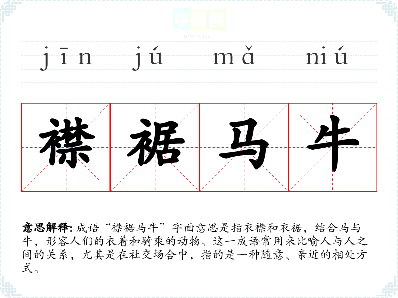 成语“襟裾马牛”字面意思是指衣襟和衣裾,结合马与牛,形容人们的衣着和骑乘的动物。这一成语常用来比喻人与人之间的关系,尤其是在社交场合中,指的是一种随意、亲近的相处方式。